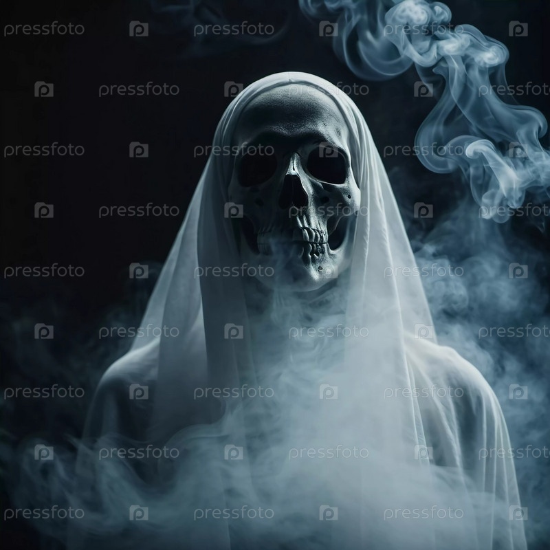 Призрачная фигура маячит в темноте. Клубящийся туман. Жуткая атмосфера. Призрак облачается в струящееся полупрозрачное платье, которое сливается с туманом, создавая тревожное визуальное ощущение. Чувство страха и тайны. ИИ