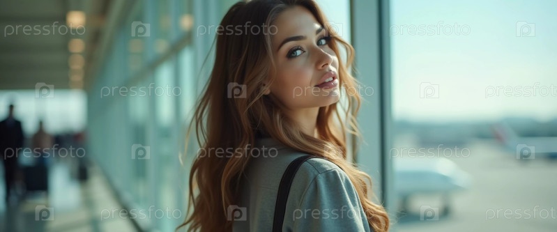 Стильная брюнетка стоит в аэропорту, держа чемодан и оглядываясь назад с уверенным выражением лица. Путешественники суетятся вокруг нее, пока она ждет, одетая в повседневную облегающую одежду. Генеративный ИИ