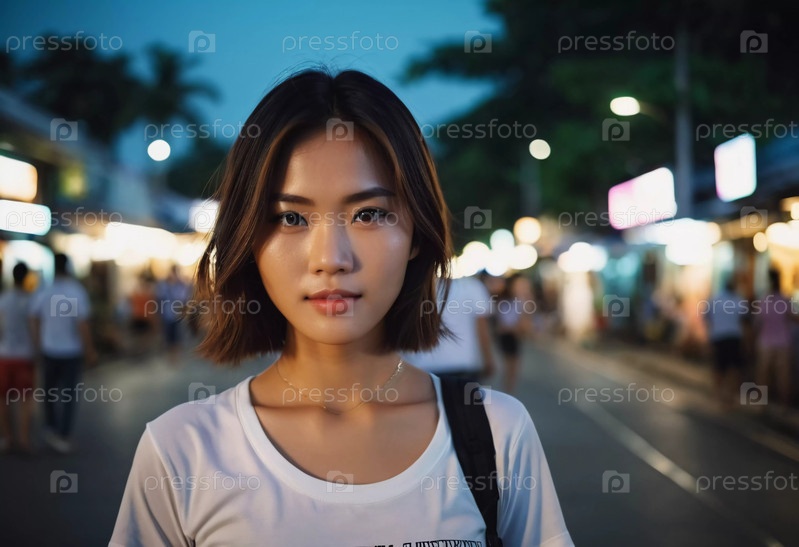 Молодая женщина позирует на оживленном ночном рынке в Таиланде. Оживленная атмосфера усиливается красочными огнями и толпами, отражающими местную культуру и ночную жизнь