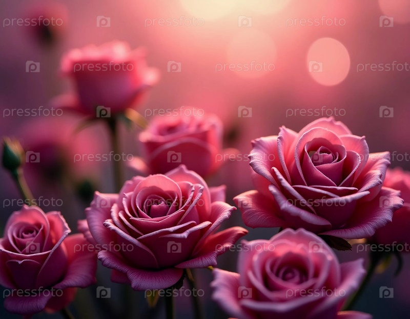 Пышная композиция из фиолетовых роз мягко светится на мечтательном фоне боке, вызывая чувства романтики и спокойствия, идеально подходящие для выражения любви или признательности Генеративный ИИ