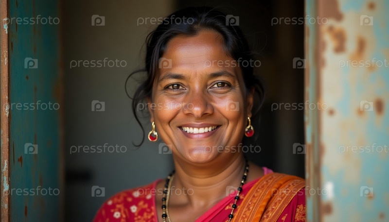 Радостная женщина в традиционном наряде стоит у двери, излучая тепло и счастье. Солнечный свет проникает сквозь нее, когда она демонстрирует пленительную улыбку, демонстрируя свою яркую культуру