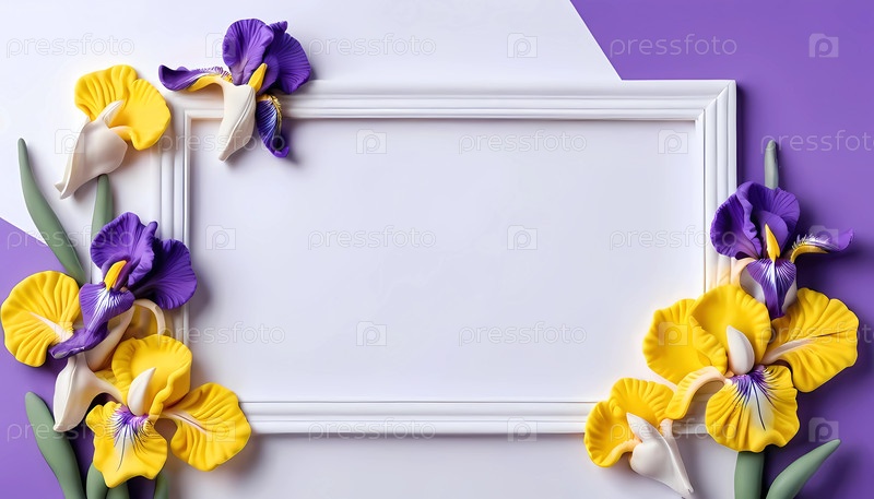 Яркие ирисы в оттенках желтого и фиолетового элегантно обрамляют чистый холст, приглашая к художественному самовыражению и творчеству. Идеально подходит для демонстрации сообщений или произведений искусства
