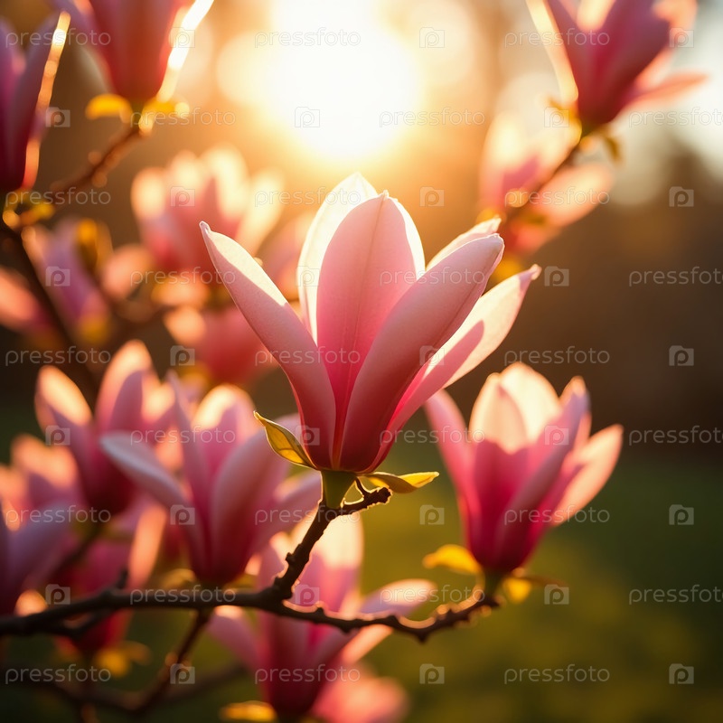 Нежные цветы магнолии, их нежно-розовые лепестки, сияющие в утреннем солнце, пробуждают сад яркими оттенками. Купаясь в золотом свете, каждый цветок, кажется, танцует от радости, когда начинается день. AI