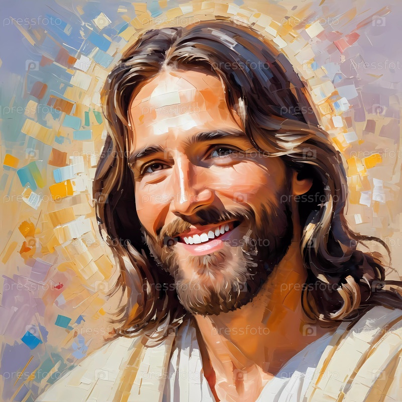 Яркое произведение искусства изображает Иисуса Христа с радостной улыбкой, окруженного теплым нимбом, на мечтательном, красочном фоне, вызывающем мир и надежду. Генеративный ИИ