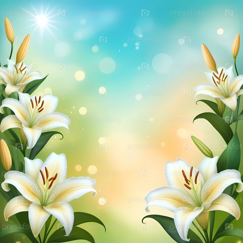 Нежные белые лилии широко распускают лепестки, обрамленные светящимся сине-зеленым фоном, с мягкими бликами боке и теплыми солнечными лучами, создающими чарующую атмосферу. Генеративный ИИ