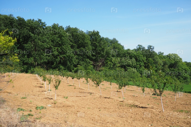 Саженец яблони высаживается в садовую землю весной, в яму. Сезон посадки деревьев. Вспаханное поле на Фрушка-Гора, Сербия, Национальный парк
