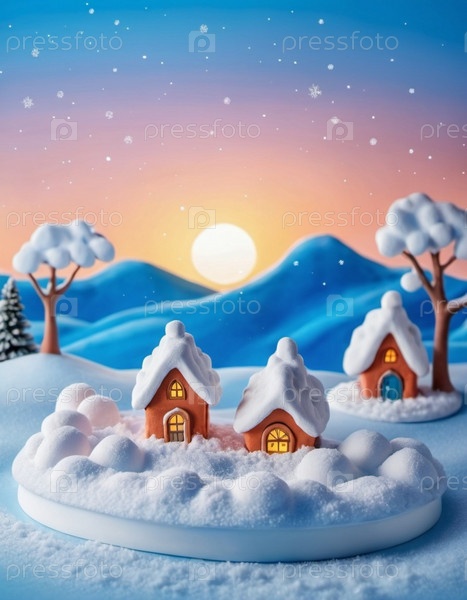Причудливая деревня, пряничный домик, заснеженные крыши, окна и дымоход. Дом окружен снегом и снежинками. Синий фон боке. Праздничная и очаровательная зимняя страна чудес. Создано с помощью ИИ