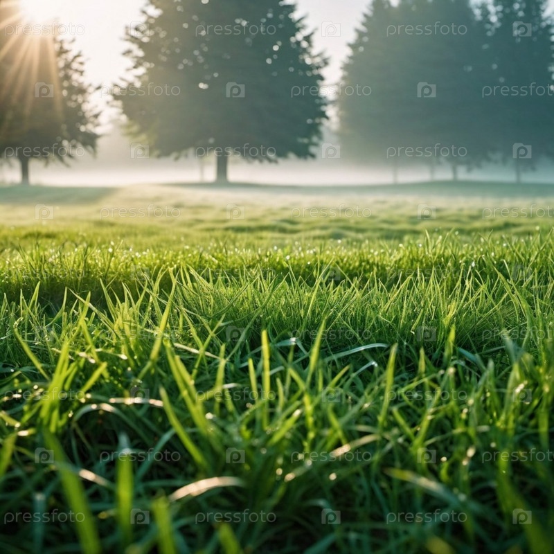 Зеленое поле травы. Туманное утро с солнцем, сияющим сквозь туман на фоне летнего леса. Деревья вдалеке размыты и создают ощущение спокойствия и мирной природы. Сгенерированный ИИ