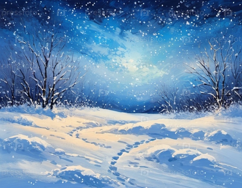 Милый рождественский пейзаж, покрытый свежим белым снегом. Чудесный зимний лес. Новогодняя рождественская атмосфера. Праздничная и очаровательная зимняя страна чудес. Снежинки, сугробы и холмы. Создано с помощью ИИ