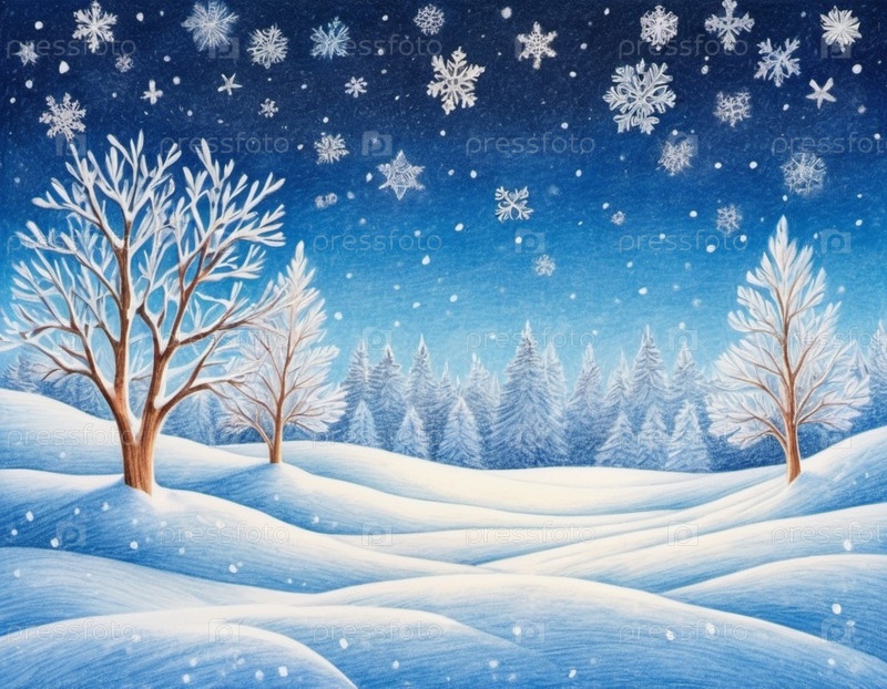 Милый рождественский пейзаж, покрытый свежим белым снегом. Чудесный зимний лес. Новогодняя рождественская атмосфера. Праздничная и очаровательная зимняя страна чудес. Снежинки, сугробы и холмы. Создано с помощью ИИ