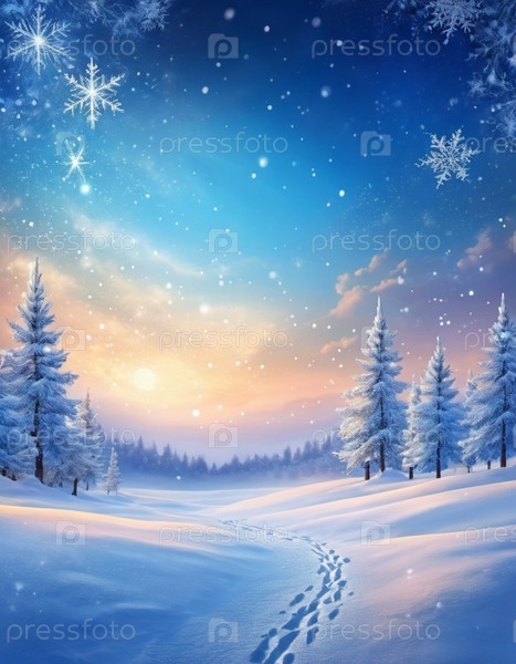 Милый рождественский пейзаж, покрытый свежим белым снегом. Чудесный зимний лес. Новогодняя рождественская атмосфера. Праздничная и очаровательная зимняя страна чудес. Снежинки, сугробы и холмы. Создано с помощью ИИ
