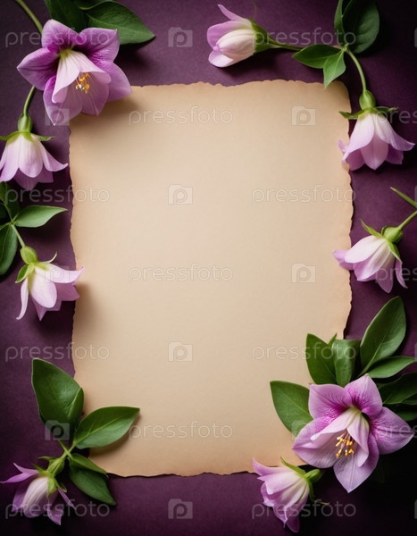 Чистый лист бумаги, окруженный рамкой из фиолетовых или синих колокольчиков. Цветы, расположенные вокруг бумаги, создают естественную красивую границу. Фон или шаблон для различных целей, пространство для копирования