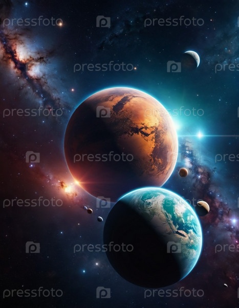 Планетарная система с несколькими планетами, большим ярко окрашенным газовым гигантом и каменистой планетой. Яркие звезды и огромное пространство темного космоса с галактикой на заднем плане. Космические просторы. Космонавтика. ИИ