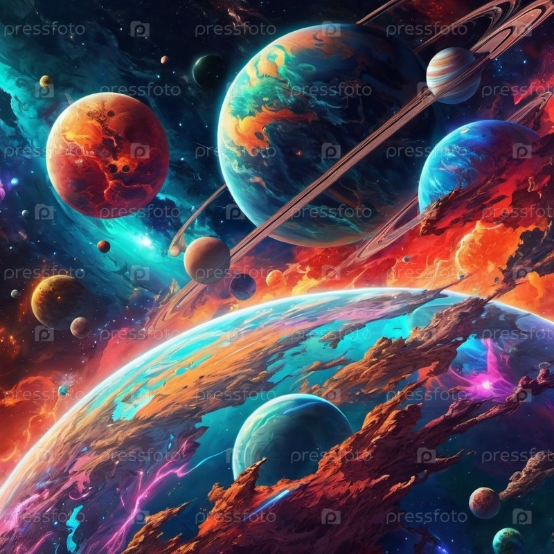 Планетарная система с несколькими планетами, большим ярко окрашенным газовым гигантом и каменистой планетой. Яркие звезды и огромное пространство темного космоса с галактикой на заднем плане. Космические просторы. Космонавтика. ИИ