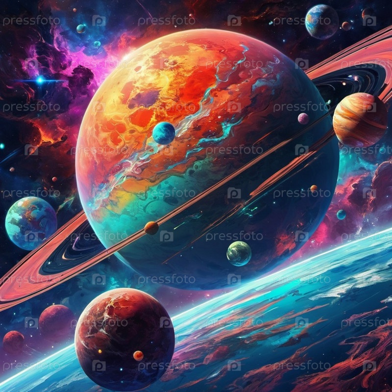 Планетарная система с несколькими планетами, большим ярко окрашенным газовым гигантом и каменистой планетой. Яркие звезды и огромное пространство темного космоса с галактикой на заднем плане. Космические просторы. Космонавтика. ИИ