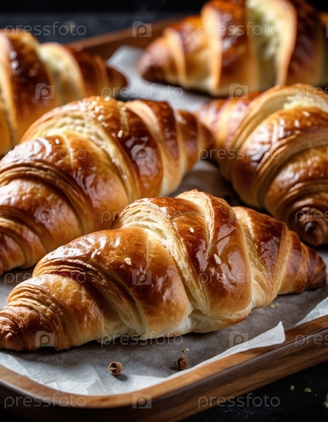 Ассорти из золотисто-коричневых круассанов на деревенском подносе. Теплый ароматный аромат наполняет уютную кухню. Привлекательная выкладка предполагает расслабляющую утреннюю встречу, идеальный завтрак-бранч с друзьями семьи