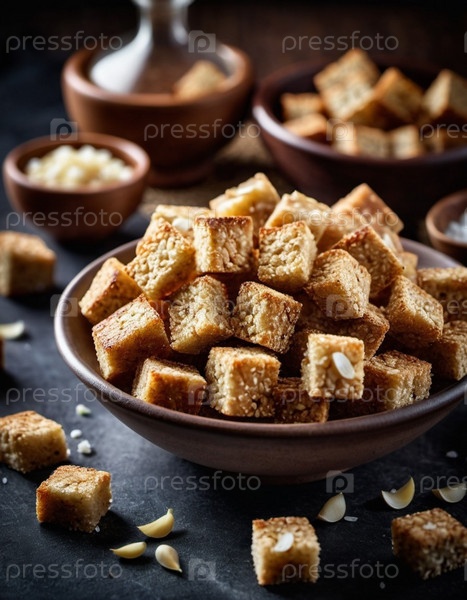 Запеченные ржаные гренки солят и настаивают на чесноке, создавая пикантную закуску, художественно оформленную в глубокой коричневой миске, окруженную. Мягкая начинка. Идеально подходит для супов, салатов или закуски к пиву