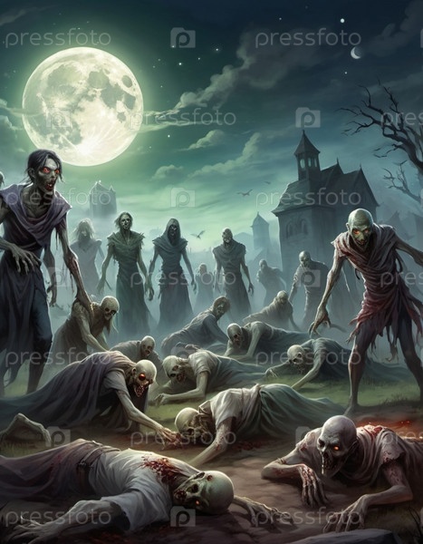 Гротескные зомби появляются из могил, разложившиеся тела освещаются лунным светом. Скелетные фигуры бродят среди надгробий, в то время как другие ползают по земле, демонстрируя свой ужасный вид. ИИ