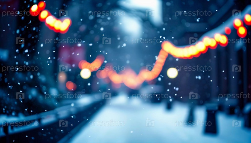 Зима приносит мягкий снегопад на городские улицы, где разноцветные огни висят над головой, создавая теплую и праздничную атмосферу. Эффект боке от огней добавляет причудливый штрих, подчеркивая радость сезона