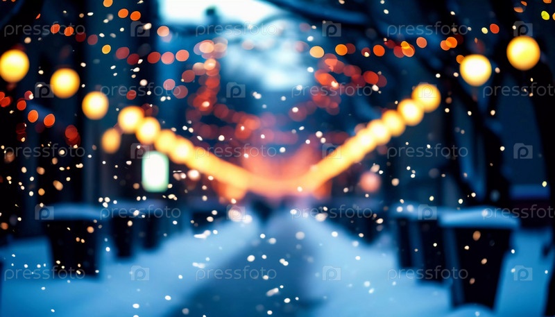 Зима приносит мягкий снегопад на городские улицы, где разноцветные огни висят над головой, создавая теплую и праздничную атмосферу. Эффект боке от огней добавляет причудливый штрих, подчеркивая радость сезона