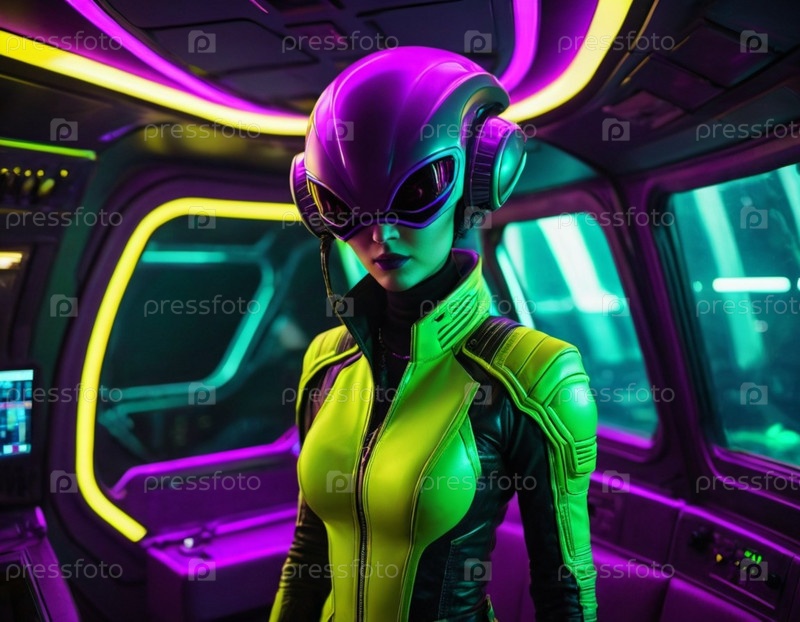 Встреча с инопланетянами в пустоте на борту футуристического космического корабля во время межзвездного путешествия через глубокий космос, раскрывающая таинственное существо. Генеративный ИИ