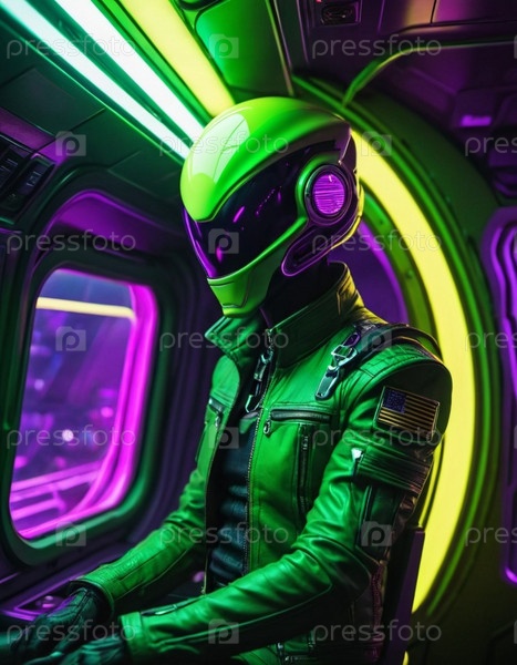 Встреча с инопланетянами в пустоте на борту футуристического космического корабля во время межзвездного путешествия через глубокий космос, раскрывающая таинственное существо. Генеративный ИИ