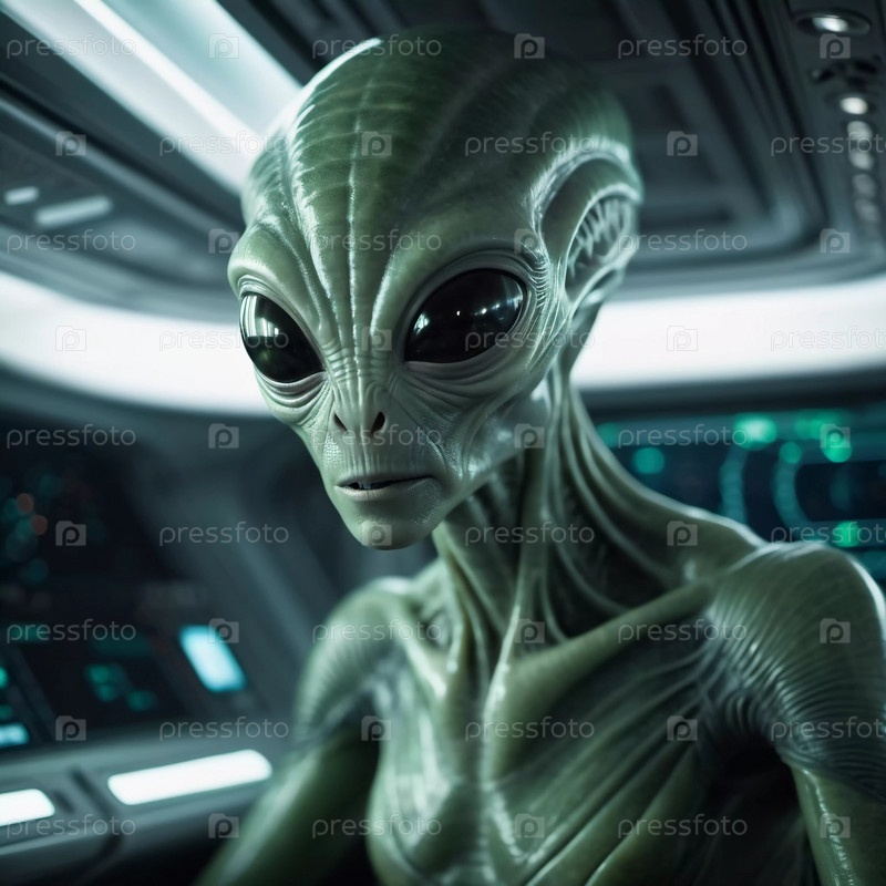 Встреча с инопланетянами в пустоте на борту футуристического космического корабля во время межзвездного путешествия через глубокий космос, раскрывающая таинственное существо. Генеративный ИИ