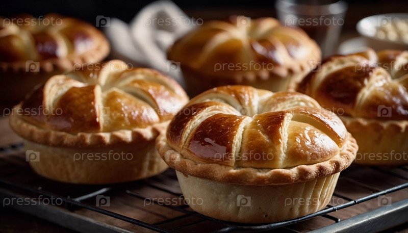 Свежеиспеченные пирожные и пироги красиво разложены на столе в теплой пекарне. Их золотисто-коричневые корочки украшены красивыми узорами, покрытыми сахарной пудрой. Генеративный ИИ