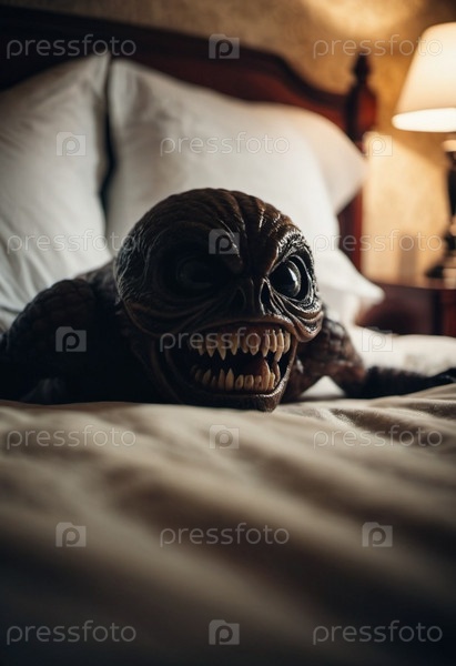 Ужасное кошмарное существо, таящееся под кроватью в тускло освещенной спальне, олицетворяющее сущность страха и неизвестности ночью. Гротескное существо с пугающими чертами тихо появляется из-под кровати. ИИ
