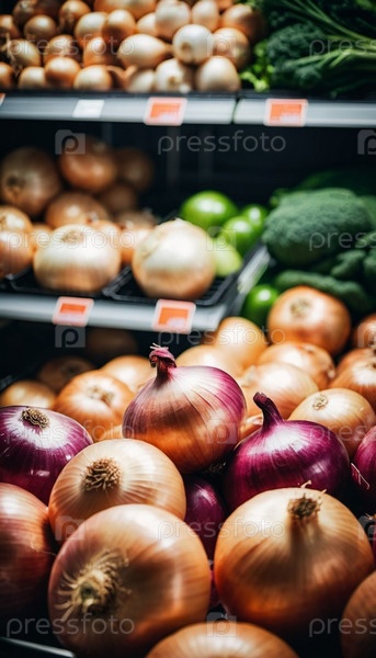Разнообразные свежие крупные луковицы аккуратно разложены на прилавке супермаркета, демонстрируя свою блестящую коричневую кожуру и приглашая покупателей выбрать их для приготовления пищи или употребления в пищу. Генеративный ИИ