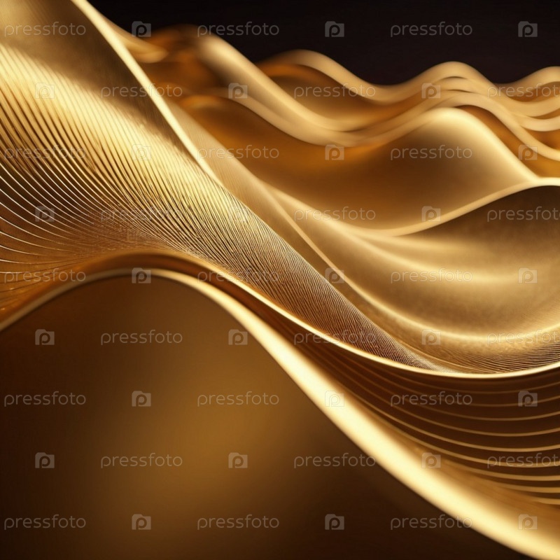 Плавные 3D-волны черного и золотого цветов создают завораживающий абстрактный узор с плавными изгибами и световыми градиентами на темном фоне, вызывающем артистизм и спокойствие. Генеративный ИИ