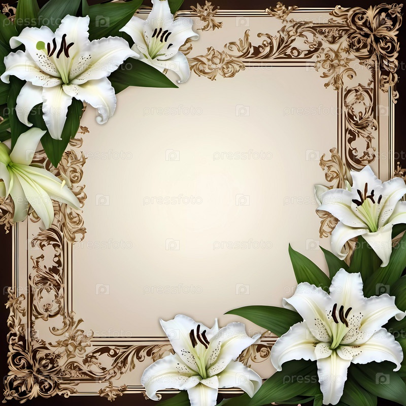 Очаровательные белые лилии с зелеными листьями создают нежную границу вокруг пустого пространства, идеально подходящую для добавления персонализированных сообщений или дизайнов. Генеративное искусство ИИ. Копировальное пространство, поздравительная открыт