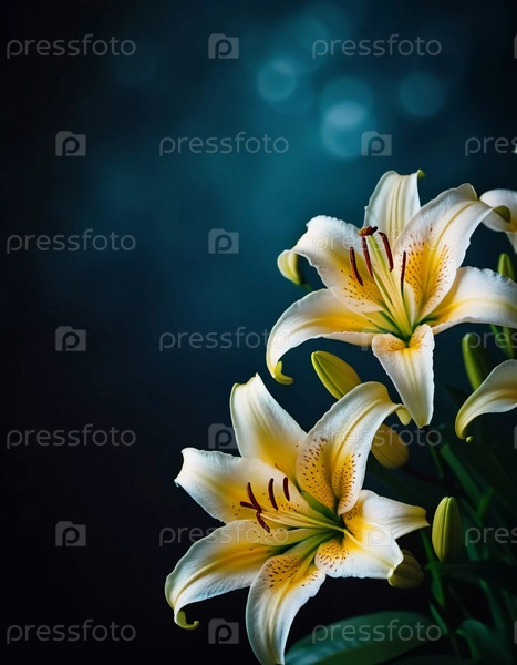 Белые лилии с нежными желтыми бликами цветут на темном фоне. Спокойная и элегантная атмосфера. Мягкое освещение подчеркивает их красоту. Генеративное искусство ИИ. Поздравительная открытка с местом для копирования