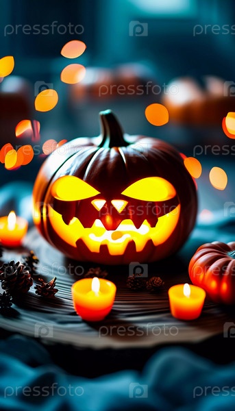 В этот Хэллоуин резная тыква излучает теплое свечение, окруженная маленькими тыквами и красочными осенними листьями, а на заднем плане мерцают праздничные огни. Генеративный ИИ