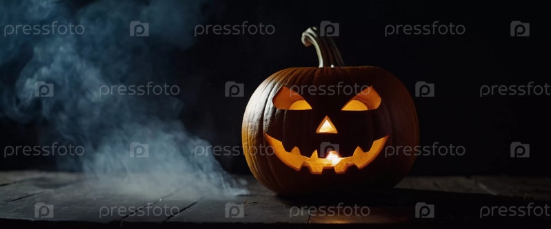 Вырезанная тыква на Хэллоуин имеет угрожающее лицо, подсвеченное изнутри, с дымом, поднимающимся вверх, что усиливает тревожную атмосферу вечера. Генеративный ИИ