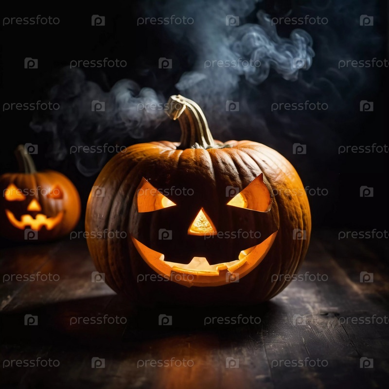 Вырезанная тыква на Хэллоуин имеет угрожающее лицо, подсвеченное изнутри, с дымом, поднимающимся вверх, что усиливает тревожную атмосферу вечера. Генеративный ИИ