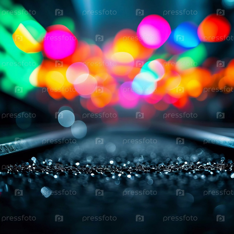 Капли воды блестят на железнодорожных путях, а красочные огни боке освещают окрестности ночью, создавая захватывающую городскую атмосферу. Генеративный ИИ