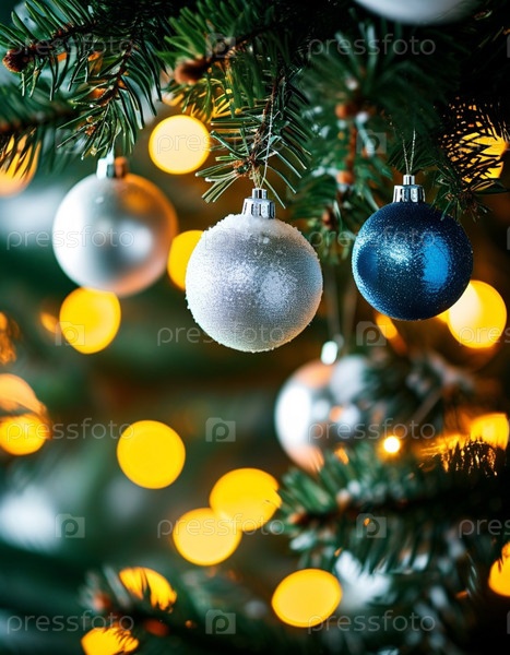 Сверкающие шары для украшений в ярких красных и золотых тонах свисают с пышной еловой ветки. Мягкие, теплые огни мерцают, усиливая праздничный дух Рождества. С Новым годом. Анаморфное боке. Генеративный ИИ