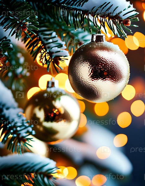 Сверкающие шары для украшений в ярких красных и золотых тонах свисают с пышной еловой ветки. Мягкие, теплые огни мерцают, усиливая праздничный дух Рождества. С Новым годом. Анаморфное боке. Генеративный ИИ