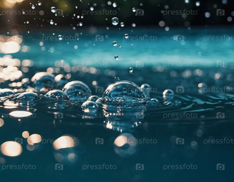 Капли воды создают завораживающие брызги в спокойном водоеме во время заката, отражая золотой свет и окружающую листву, демонстрируя красоту природы. Застывшее движение. Генеративный ИИ