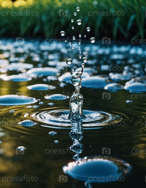 Капли воды создают завораживающие брызги в спокойном водоеме во время заката, отражая золотой свет и окружающую листву, демонстрируя красоту природы. Застывшее движение. Генеративный ИИ