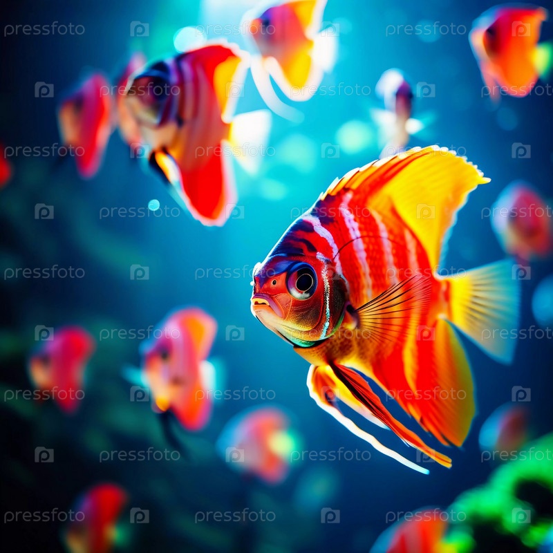 Группа потрясающих тропических рыб скользит по яркому коралловому рифу, их яркие цвета отражают солнечный свет. Подводный мир полон движения и жизни. Генеративный ИИ