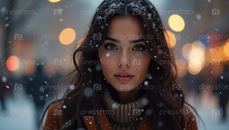 Потрясающая женщина смотрит мягко, пока снежинки падают вокруг нее в восхитительной городской обстановке, захватывая магию рождественского сезона. Красивая брюнетка с длинными волосами. Генеративный ИИ