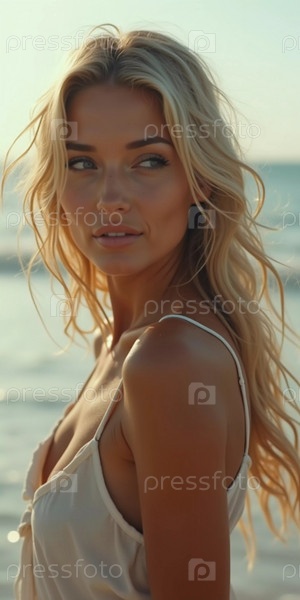 Блондинка в купальнике смотрит назад, стоя у береговой линии. Нежные морские волны плещутся у ее ног под ясным голубым небом. Длинные волосы, красивое молодое лицо. Реклама путешествий и одежды. AI