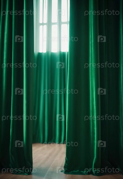 Штора с мягкими плавными струящимися складками. Глубокий зеленый цвет и роскошная фактура создают драматичную и элегантную атмосферу. Декор и дизайн интерьера. Дорогая штора из богатой ткани. AI