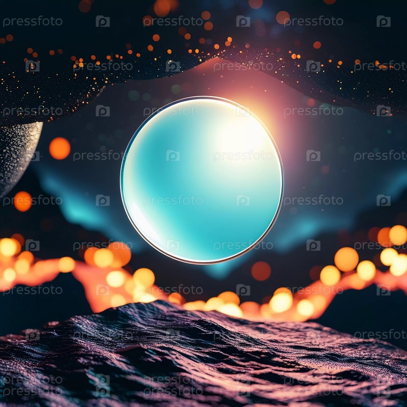 Абстрактный круг парит среди яркой среды, с динамическими оттенками, отражающимися от пересеченной местности. Сцена освещена далекими огнями, создавая завораживающую атмосферу. Генеративный ИИ