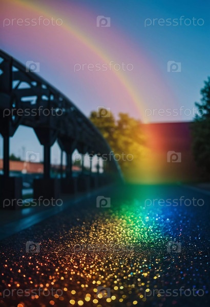 Яркая радуга тянется вниз к траве, создавая прекрасное зрелище в залитом солнцем саду. Пышная зелень окружает сцену, подчеркивая ее естественную красоту. Генеративный ИИ