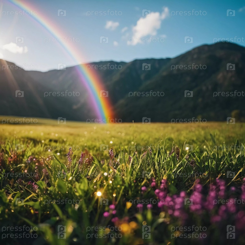 Яркая радуга тянется вниз к траве, создавая прекрасное зрелище в залитом солнцем саду. Пышная зелень окружает сцену, подчеркивая ее естественную красоту. Генеративный ИИ