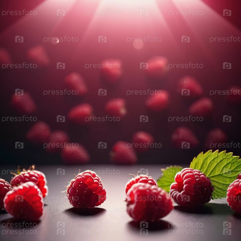 Несколько спелых ягод малины искусно размещены на темной поверхности, а свет подчеркивает их насыщенный цвет и текстуру, создавая визуально привлекательную экспозицию. Генеративный ИИ