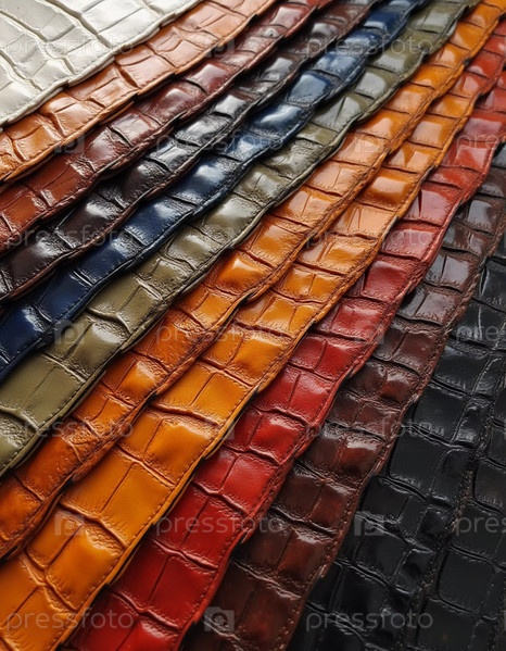 Различные образцы натуральной крокодиловой кожи представлены в ярких цветах. Каждый экземпляр демонстрирует уникальные текстуры и отделки, привлекательные для любителей кожи и дизайнеров. Генеративный ИИ